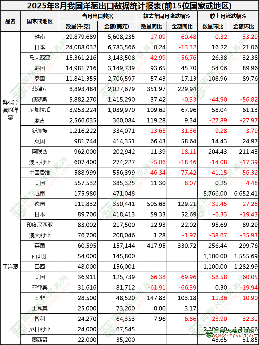 2025年8月洋葱出口数据(按国家)