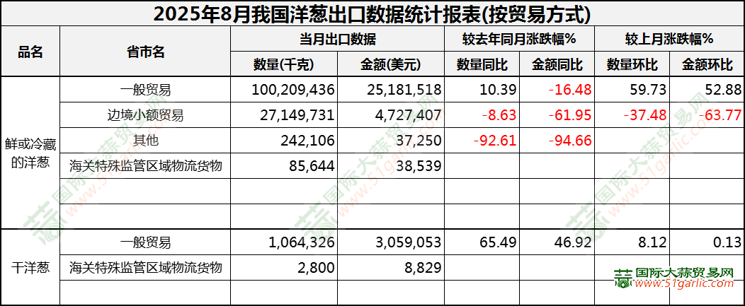 2025年9月洋葱出口数据(按贸易方式)