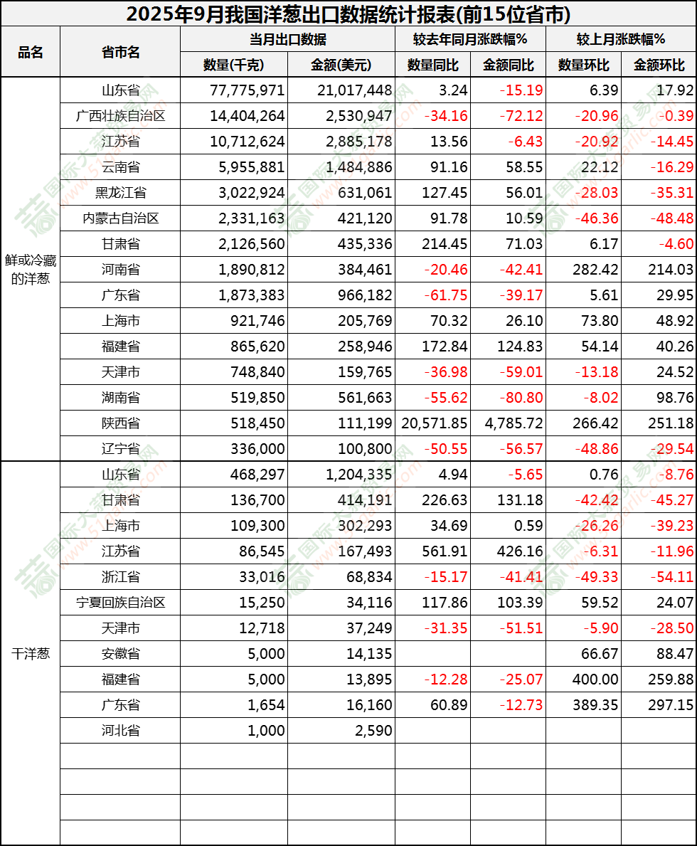 2025年9月洋葱出口数据(按省市)
