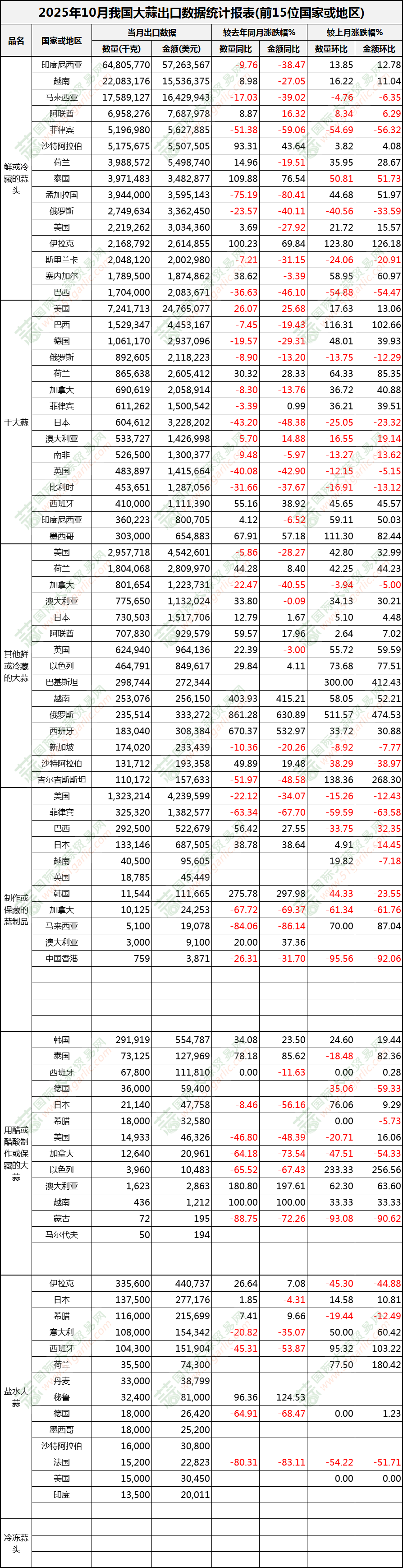 2025年10月大蒜出口数据(按国家)