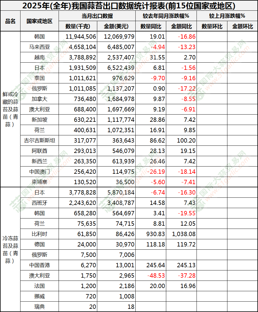 2025年全年蒜苔出口数据(按国家)