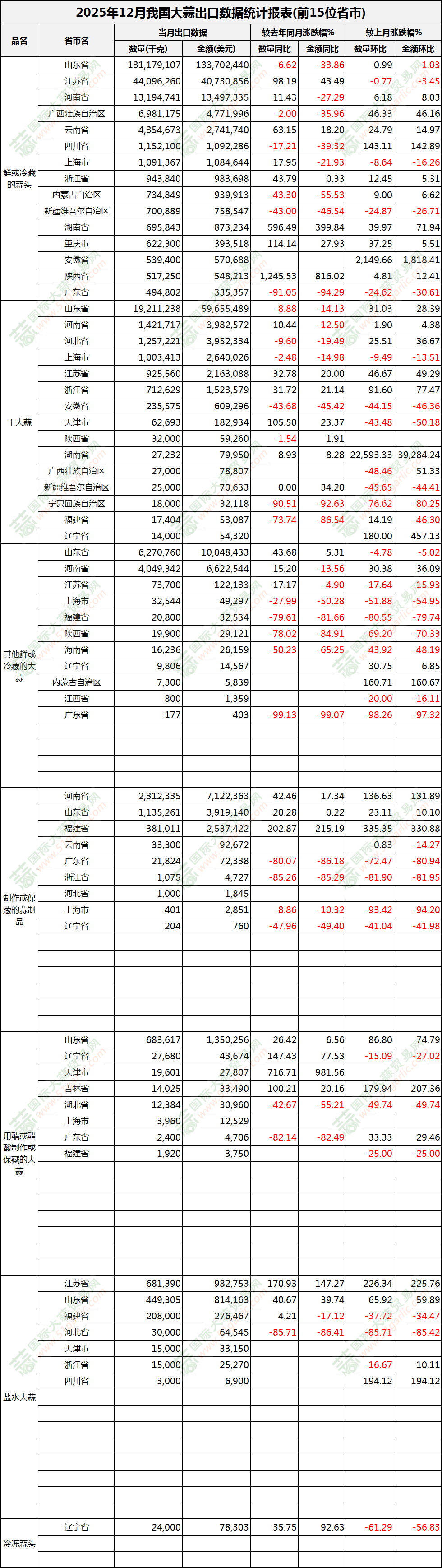 2025年12月大蒜出口数据(按省市)