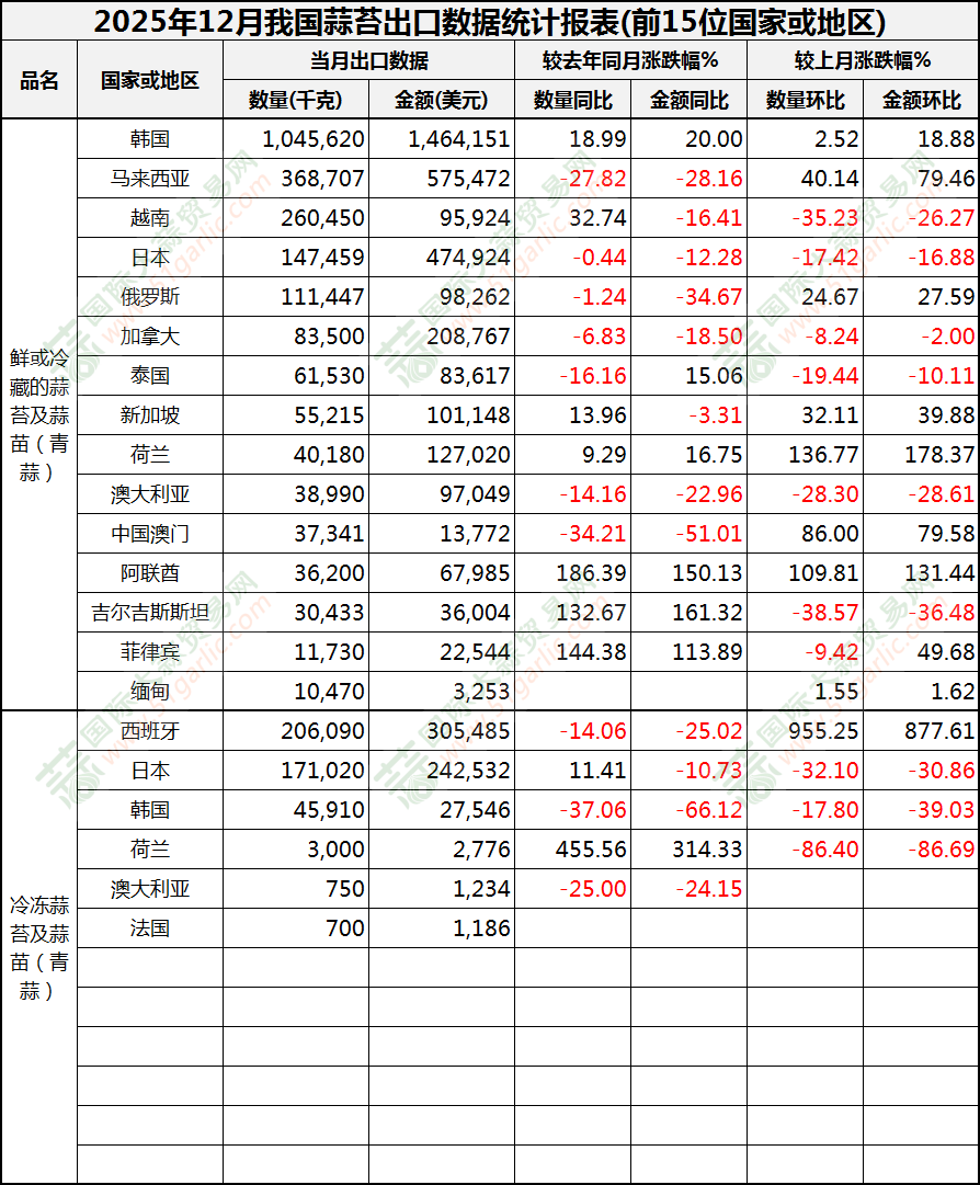 2025年12月蒜苔出口数据(按国家)