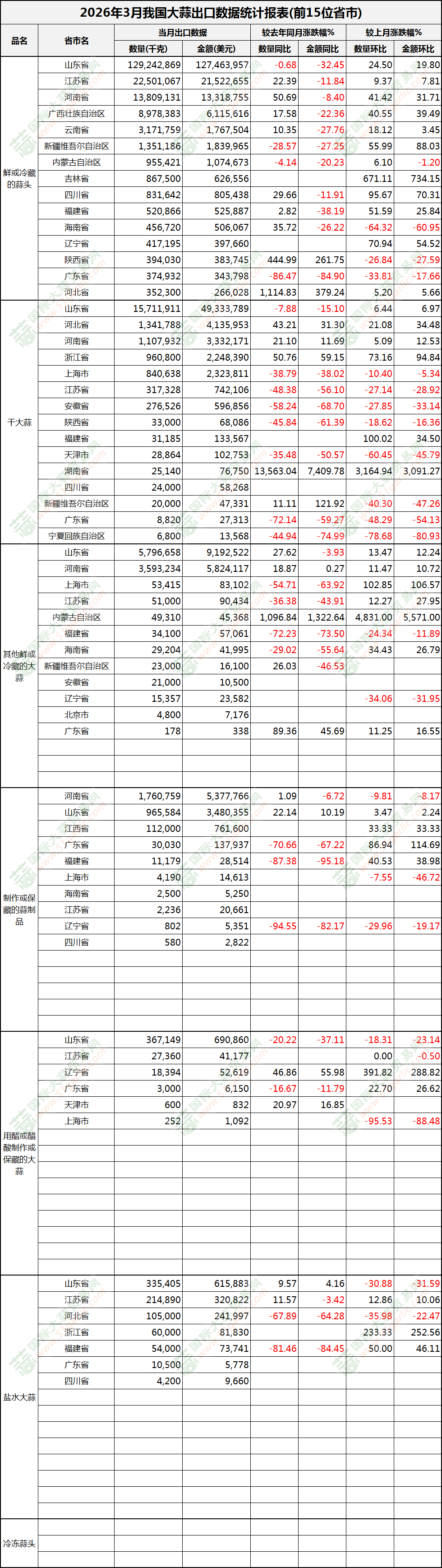 2026年3月大蒜出口数据(按省市)新