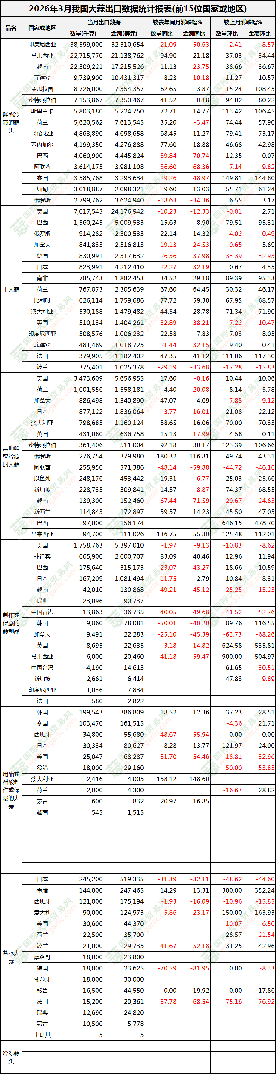 2026年3月大蒜出口数据(按国家)新