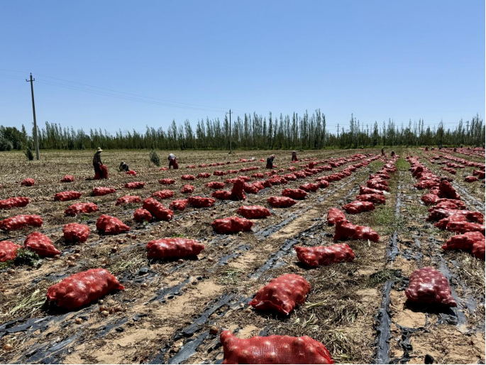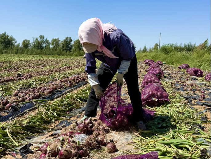 丰收的喜悦不仅洋溢在种植户脸上,也惠及了周边务工群众。在十里沙村的洋葱地里,不少务工人员忙着采收、搬运。