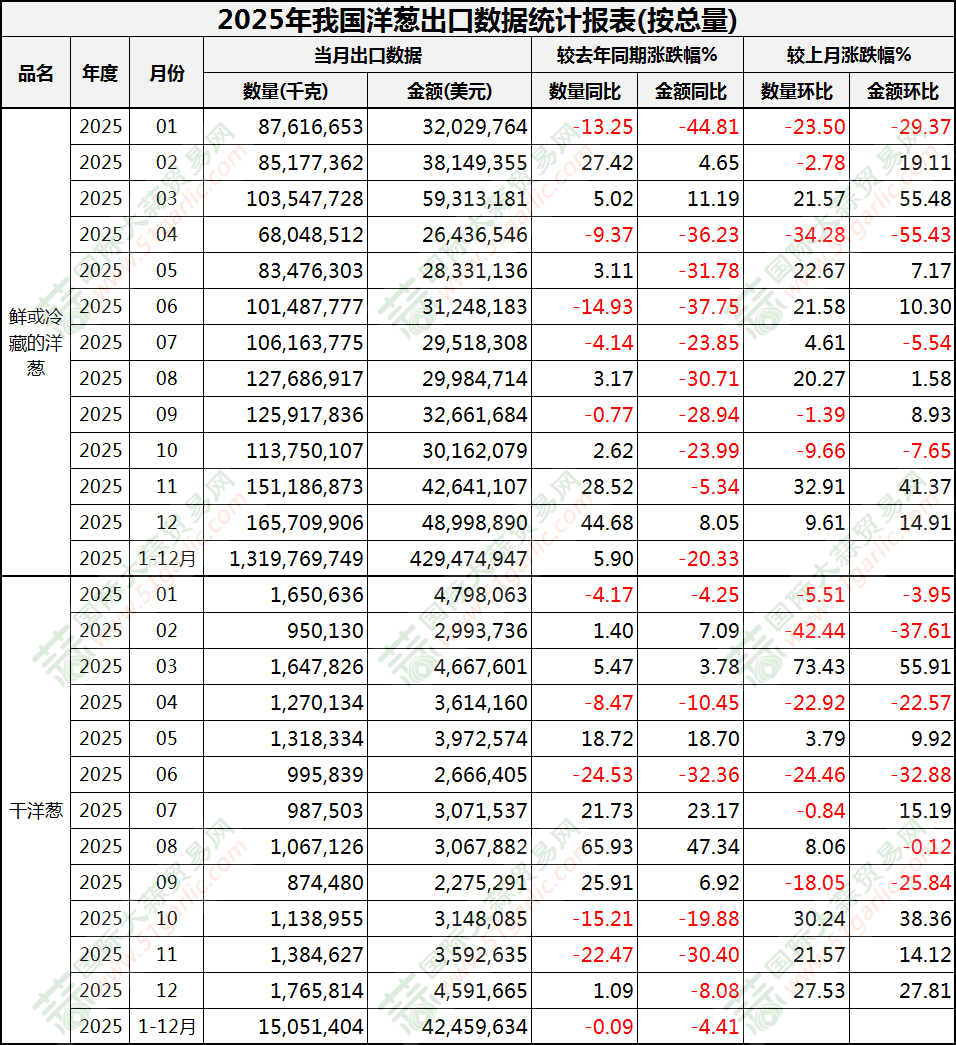 2025年1-12月洋葱出口数据(按总量)