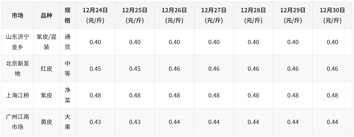 近期全国洋葱市场价格整体呈现稳中偏强运行态势。在主要销地批发市场,洋葱交易量逐步回升,价格保持稳定。以山东济宁金乡大蒜专业批发市场为例,通货洋葱自12月中旬以来维持在0.40元/斤左右,较月初0.38元/斤上涨约5.3%,反映出终端市场需求逐步回暖。北京新发地、上海江桥等大型批发市场的紫皮和红皮洋葱到货价格也基本稳定在0.42–0.48元/斤区间,未出现明显波动。