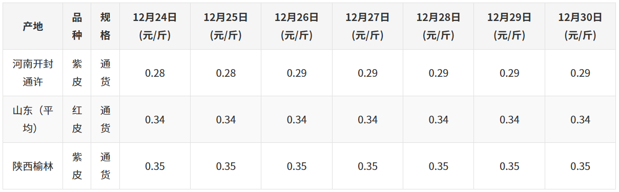 主产地方面,河南开封通许县紫皮洋葱报价从长期稳定的0.28元/斤于12月19日起小幅上调至0.29元/斤,并持续至今,涨幅约3.6%;山东产区红皮洋葱价格由前期0.35元/斤微降至0.34元/斤,降幅约2.9%,主要受阶段性出货节奏影响;陕西榆林紫皮洋葱价格则从12月10日的0.37元/斤逐步回落至当前0.35元/斤,累计下降5.4%,显示该区域存在一定的去库压力。