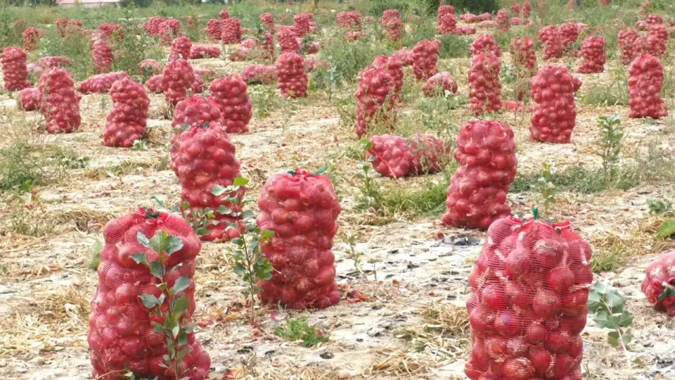 9月10日,巩留县阿尕尔森镇阿尕尔森村种植的洋葱喜获丰收,一袋袋新鲜饱满的洋葱被整齐堆放在田埂旁,等待装车外运。