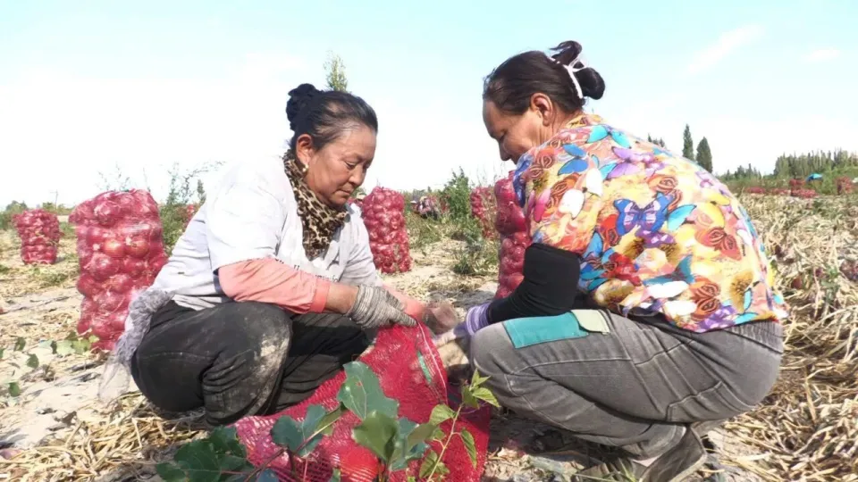 工人杨秀:“我来地里收洋葱两天了,工钱是按袋算的,一袋2.5元,你捡的越多工钱越多,作为邻居来过来帮帮忙,还能给家里补贴一下家用,两全其美。”