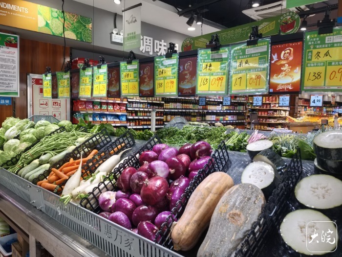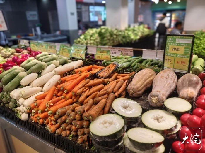 大皖新闻记者首先来到位于六安市云露街上的某星鲜果生活超市,进门店后发现蔬菜粮油区离门口很近,很远就看到插在货架上的“六安市‘惠民菜篮子’专用标价签”,旁边的电子显示屏上播放着惠民商品价格公示,货架上摆放着参与活动的胡萝卜、青萝卜、白萝卜和冬瓜,这4种蔬菜的价格从1.38元/斤、1.88元/斤、1.90元/斤和2.13元/斤,统一降为0.99元/斤;毛白菜、大葱的价格也从2.65元/斤、2.58元/斤,降到2.08元/斤和1.98元/斤。