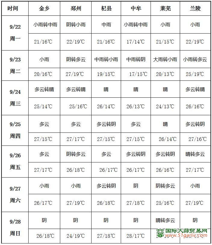 本周,大蒜产区普遍呈现多云及阴雨天气,整体气温相对偏低。金乡、邳州、杞县、中牟等产区,降水主要集中在前期和后期,前期多小雨、中雨天气,后期也有小雨出现,中期则以多云或晴好天气为主。气温方面,最高温大多在 20 - 28℃之间,最低温基本处于 13 - 19℃范围。持续的降雨或大雨可能导致田间积水,进而影响大蒜的正常播种,并可能致使部分产区的种植时间被迫延后。