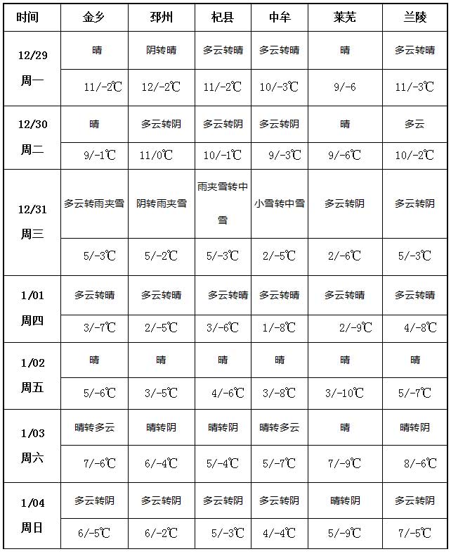 本周(12月29日至1月4日),金乡、邳州、杞县等大蒜主产区受冷空气影响,天气将出现冷暖大反转,局部地区周内有降水。前期(12月29日至12月30日)以晴或多云为主,气温多在-2℃至12℃,整体偏暖;12月31日天气波动明显,多地出现雨夹雪、小雪转中雪等降水天气,气温骤降至-5℃至5℃;元旦过后,产区气温逐步回升,天气以晴或多云为主。