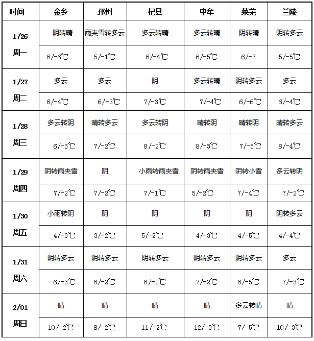 本周(1月26日—2月1日),大蒜主产区(金乡、邳州、杞县、中牟、莱芜、兰陵)天气呈现先冷湿、后晴暖的变化特征。气温方面,前期(1月26日—30日)整体偏低,各地最低气温多在-7℃至-1℃,最高气温6℃—7℃;后期(1月31日—2月1日)明显回升,2月1日各地最高气温达8℃—12℃,最低气温2℃—3℃。降水与天气方面,1月26日、29 日多地出现雨夹雪/小雪,1月30日金乡预报有小雨,其余时段以阴、多云为主。