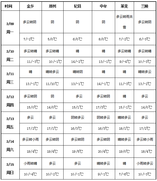 未来一周(2月9日至15日),国内大蒜主产区天气呈波动变化,气温整体呈 “先升后降” 走势,降水过程较为零散。前期莱芜出现雨夹雪,随后各地转晴升温,气温逐步攀升至 14-18℃的阶段性高点;后期金乡、兰陵等地出现小雨,之后气温明显回落,最低温跌至 - 6℃到 - 1℃,天气由暖转冷。其余时段以晴好、多云为主,无大范围降水。