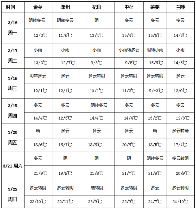 3月16日-22日,山东金乡、邳州、莱芜、兰陵及河南杞县、中牟等大蒜主产区天气以阴天多云稳为主、晴好天气较少,气温冷暖交替。16-17日以阴天、多云为主,其中金乡、邳州、杞县、中牟、兰陵均有小雨过程,气温小幅回落,最低温普遍在3-6℃,最高温12-15℃;18-19日转为阴转多云或多云天气,最低温降至 1-4℃,部分区域(如莱芜、兰陵)最低温逼近 0℃,昼夜温差显著拉大;20-22日天气大幅转好,金乡、莱芜迎来晴天,其余产区为多云或多云转阴,气温显著回升,最高温升至 18-24℃,最低温也回升至 7-10℃,整体湿度随晴好天气逐步降低。