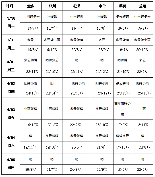 未来一周(3月30日—4月5日),金乡、邳州、杞县、中牟、莱芜、兰陵等大蒜主产区天气以多云、阴天为主,并伴随短时降雨:3月30日多为小雨转晴/多云,3月31日邳州、兰陵有小雨,4月2日多地阴转小雨,4月3日莱芜有雷阵雨转小雨、兰陵有小雨,其余时段以多云或晴天为主。温度方面,整体呈先升后稳趋势,最低温7—13℃,最高温16—26℃,4月2日前后多地最高温达23—24℃,昼夜温差维持在8—14℃,早晚偏凉。