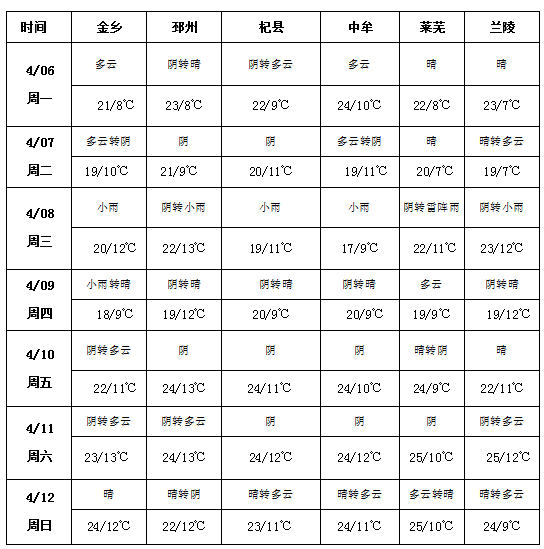 本周(4月6日-12日)金乡、邳州、杞县、中牟、莱芜、兰陵等大蒜主产区天气以多云天气为主,周中将出现短暂降雨。4月6-7日以多云、晴好天气为主,无明显降水,气温平稳,最高温19-24℃、最低温7-11℃,昼夜温差偏大;4月8日产区迎来集中降水,多为小雨,莱芜出现雷阵雨,气温小幅波动;4月9日起各地陆续转晴,气温持续回升,最高温逐步攀升至22-25℃,最低温稳定在9-13℃。