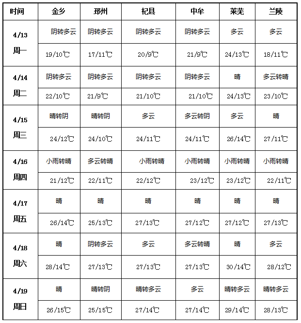 4月13日-19日,金乡、邳州、杞县、中牟、莱芜、兰陵等大蒜主产以晴好多云天气为主,降水量较少。周初(13-14日)以阴转多云为主;16 日金乡、杞县、中牟、莱芜、兰陵普降小雨;周末(17-19日)以晴好天气为主。气温方面,整体呈阶梯式回升,周初最高气温多在17-24℃,周末最高气温普遍升至25-30℃,昼夜温差维持在10-15℃。