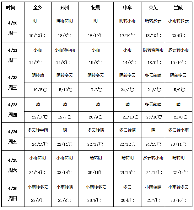 本周(4月20日-26 日),金乡、邳州、杞县、中牟、莱芜、兰陵等大蒜主产区以阴雨天气为主,晴好天气较少。20日-21日多为小雨或阵雨天气;22 日起多数产区由阴转晴或多云转晴,23日更是大范围晴好天气;24日-26 日,产区再次迎来降水过程。与上周相比,本周大蒜主产区气温大幅下降,昼夜温差加大,周内金乡产区最低气温为8℃,最高气温为24℃。